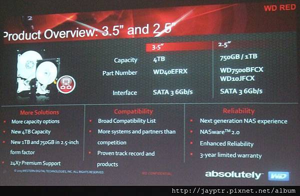 這是目前WD紅標在市面上的規格,紅標硬碟尺寸有出2.5和3.5吋的,容量是1TB~4TB 64MB(3.5吋)、750GB~1TB 16MB(2.5吋),介面是SATA 6Gb/s,保固都是三年。