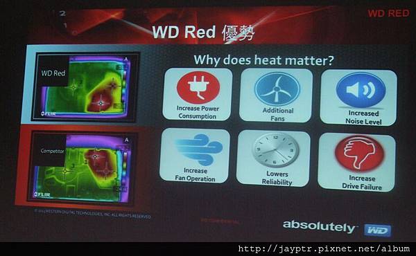 WD紅標與他牌的硬碟熱量紅外線分布圖,從圖中可以發現紅標紅色區域比他牌的小,顏色也比較偏深綠,表示紅標產生出來的廢熱比他牌的少。