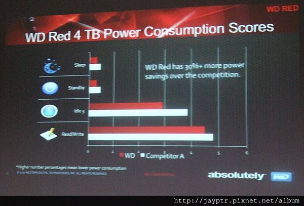 WD紅標4TB與他牌4TB硬碟做耗能比較,可以發現在四種狀況下紅標的耗能都低於他牌。