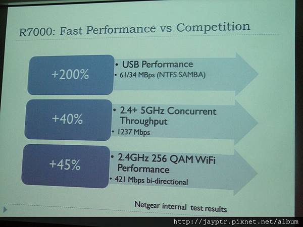 USB性能比他牌的快200%(可達到61/34Mbps NTFS格式),2.4GHz+5GHz同時進行傳輸,速度上比他牌快40%(平均可達當1237Mbps),2.4GHz 256 QAM無線網路效能可達到421Mbps,贏過他牌45%。