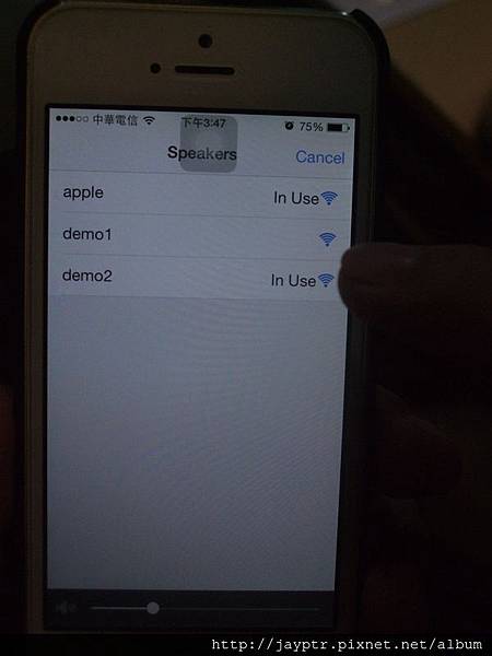 點選音樂進去就會看到這台分享器下共有三個喇叭可以使用(demo 1、demo 2、apple),當有被其它玩家使用的喇叭會被標記In Use。