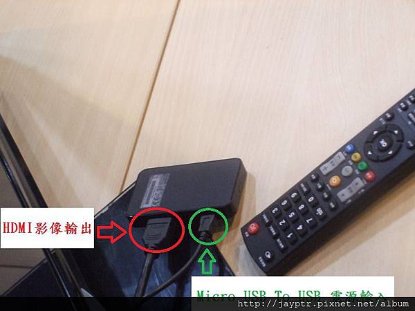 這個是體驗PTV3000,上面會接上兩條線分別是HDMI影像輸出到電視使用,Min USB To USB 電源輸入使用。