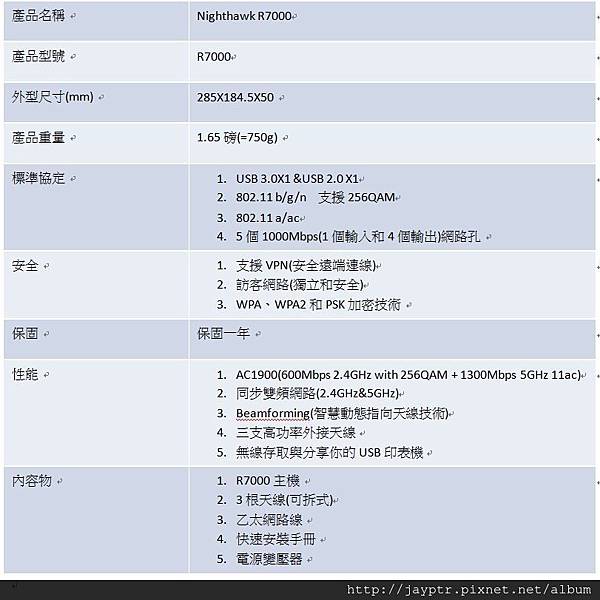 Nighthawk R7000讓802.11 g/n/ac 都具備有智慧動態指向天線技術讓使用的人能有極佳的網路連線品質,不使用網路的人也不會接收到大量地電磁波,而且採用雙核心處理器,2.4GHz和5GHz分流處理.....等優點,這是一台無法挑剔的無線分享器。