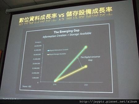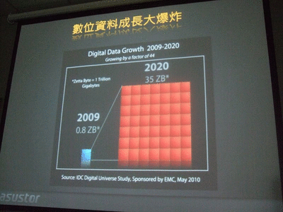 數位資料在2009年有0.8ZB(0.8ZB等於8億TB),預估2020年數位資料量將擁有35ZB(35ZB等於350億TB)。