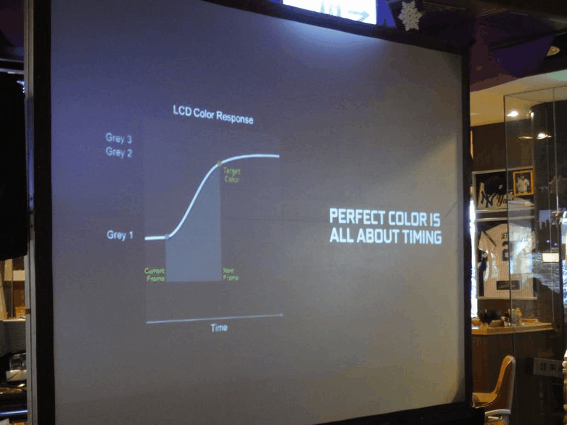 撕裂與卡頓外可以發現時脈與色彩顯現是有關連的,因為每個張影像間都有對應到不同的灰階色彩,理論上每張影像都需要對應到正確的顏色上面,但是在更新率是變動時,每張影像是很難正確的落於正確的灰階顏色上,而G-SYNC可以讓每張影像的灰階落於正確灰階值上。